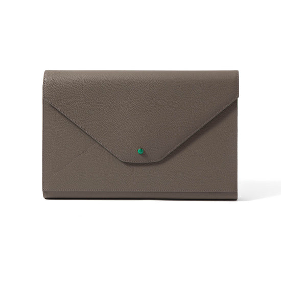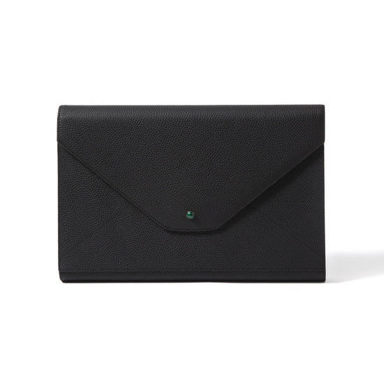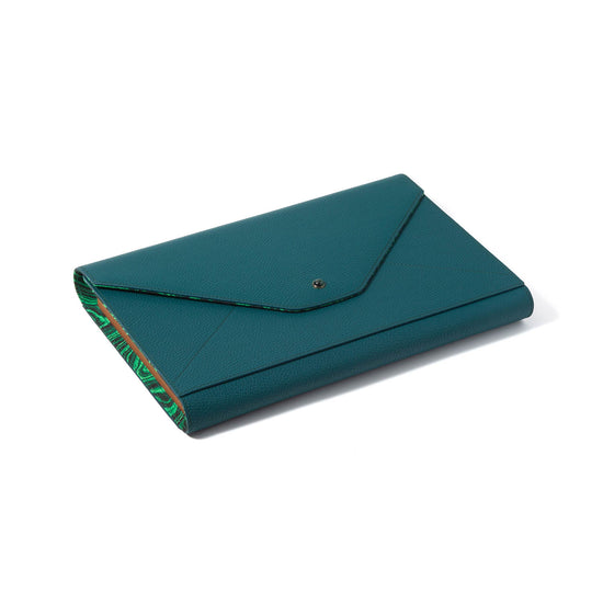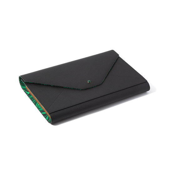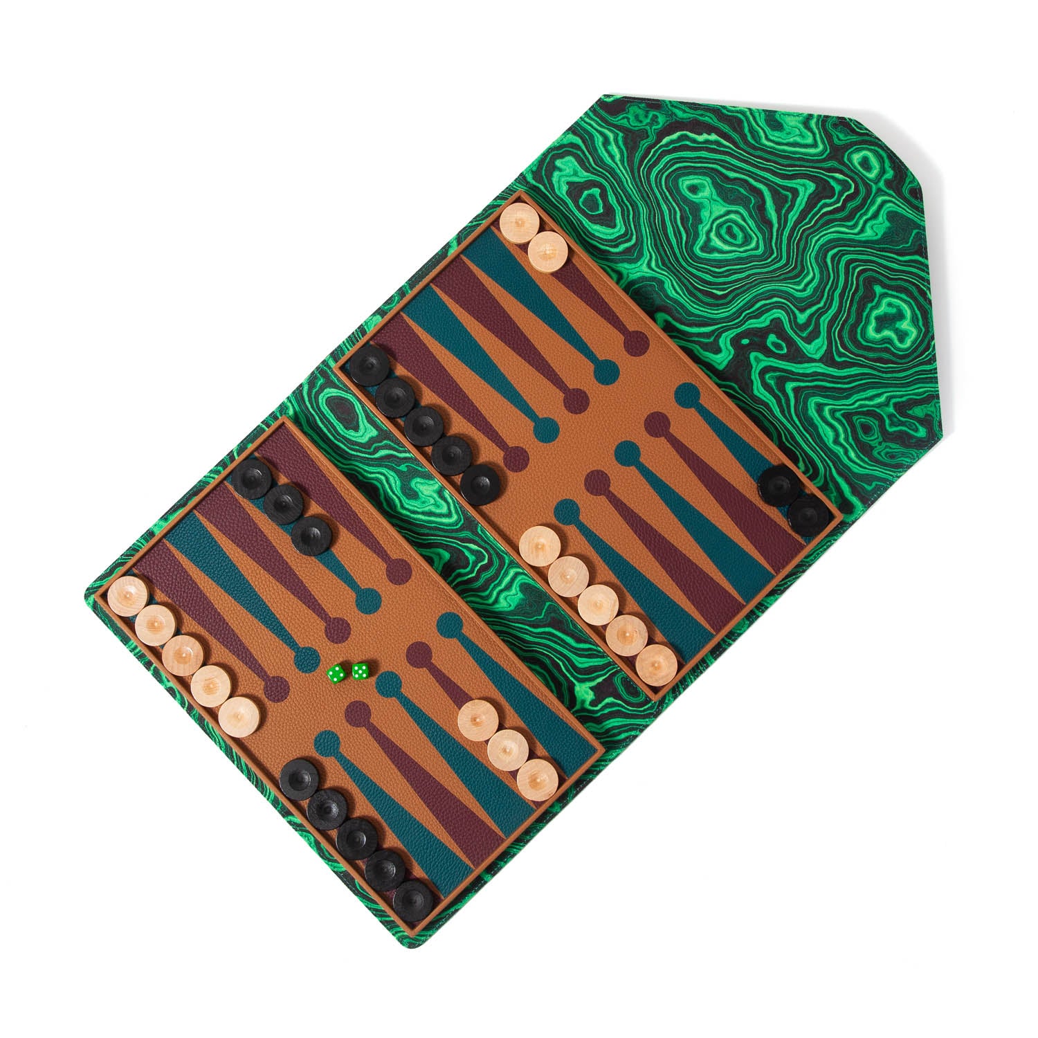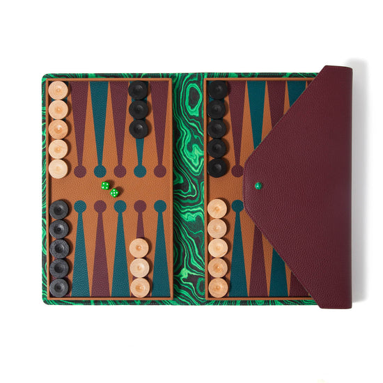 This travel backgammon set is crafted in Madame Malachite’s signature envelope form and sealed with a natural malachite cabochon. Each piece is handcrafted using leather marquetry techniques, blending geometry, symbolism, and function into a slim, sculptural silhouette.