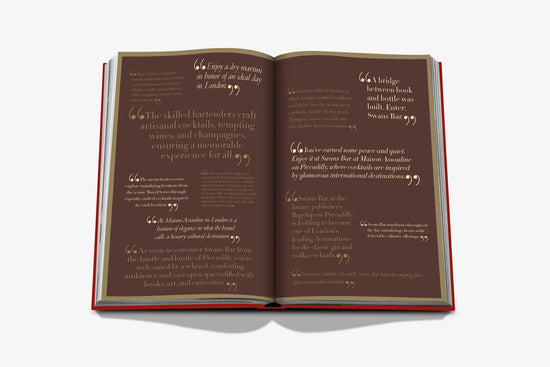 Opened in 2014, when London was basking in a new dawn of cocktail renaissance, Swans Bar has been offering for ten years an array of exclusive cocktails in a tucked-away space surrounded by the store’s expansive bookshelves. Clean lines, aprons, impeccable uniforms and minimalist garnishes are mixed with five-star-meets-friendly-local hospitality, making it a true bastion of elegance and culture. Developed exclusively by on-site mixologists, many of the drinks are inspired by popular Assouline book titles, transporting guests to unexpected destinations with each sip.